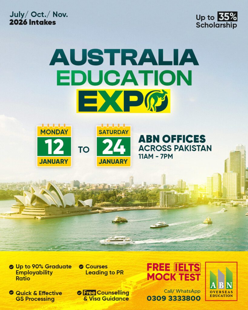 ABN Overseas Education presents the Australia Education Expo for February & July 2026 intakes, offering up to 35% scholarships for eligible students.